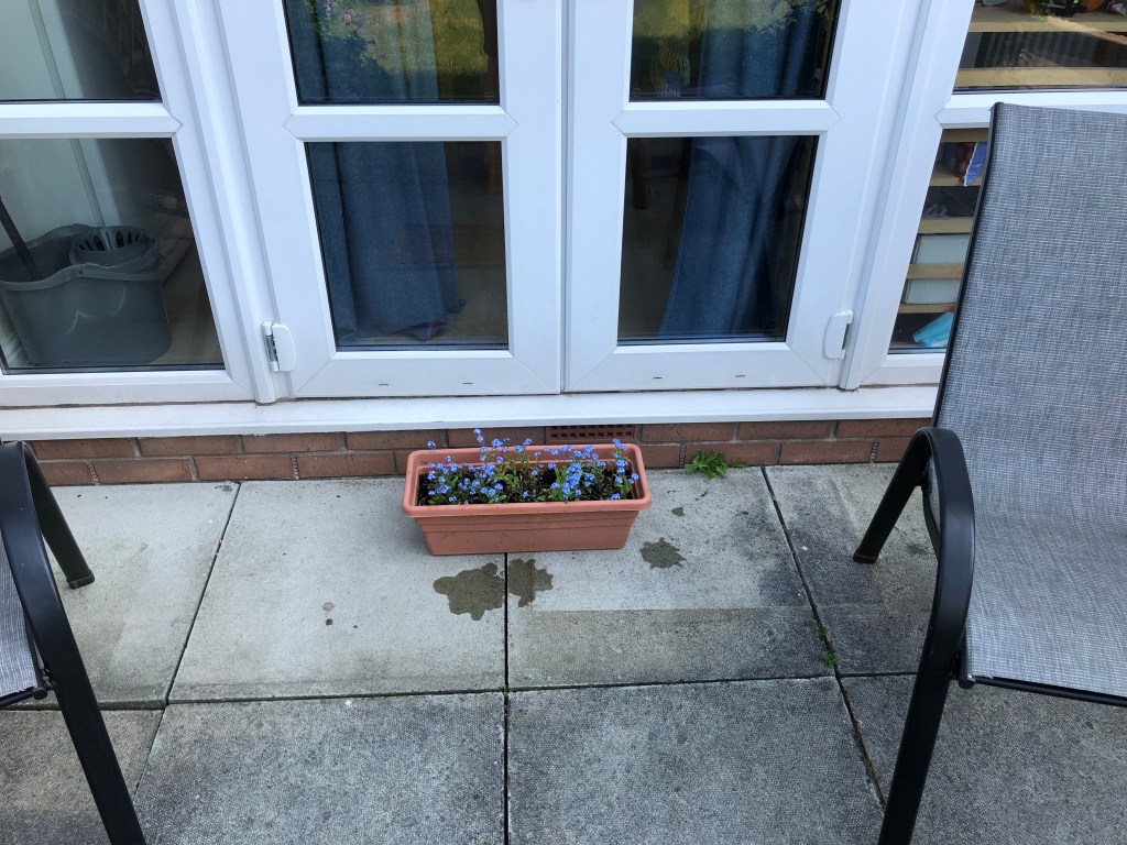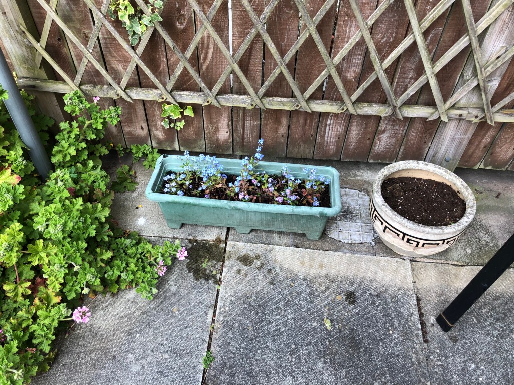 An unexpected project (besides rearranging the outdoor furniture and flower pots which I’ve loved doing since age five as my mother will tell you) became transplanting and caring for a few of the (previously planted?) Forget-Me-Nots beneath one of the shrubs. I really needed to mow the lawn, but these tiny blue flowers had spread into the grass, and I didn’t want to just mow them down, so I decided to transplant them to some window boxes on the patio and hoped for the best.